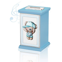Skarbonka z pozytywką miś w czapce dla chłopca z grawerem- prezent na I Komunię Św.