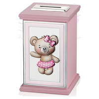 Skarbonka z pozytywką miś dla dziewczynki z grawerem- prezent na I Komunię Św.